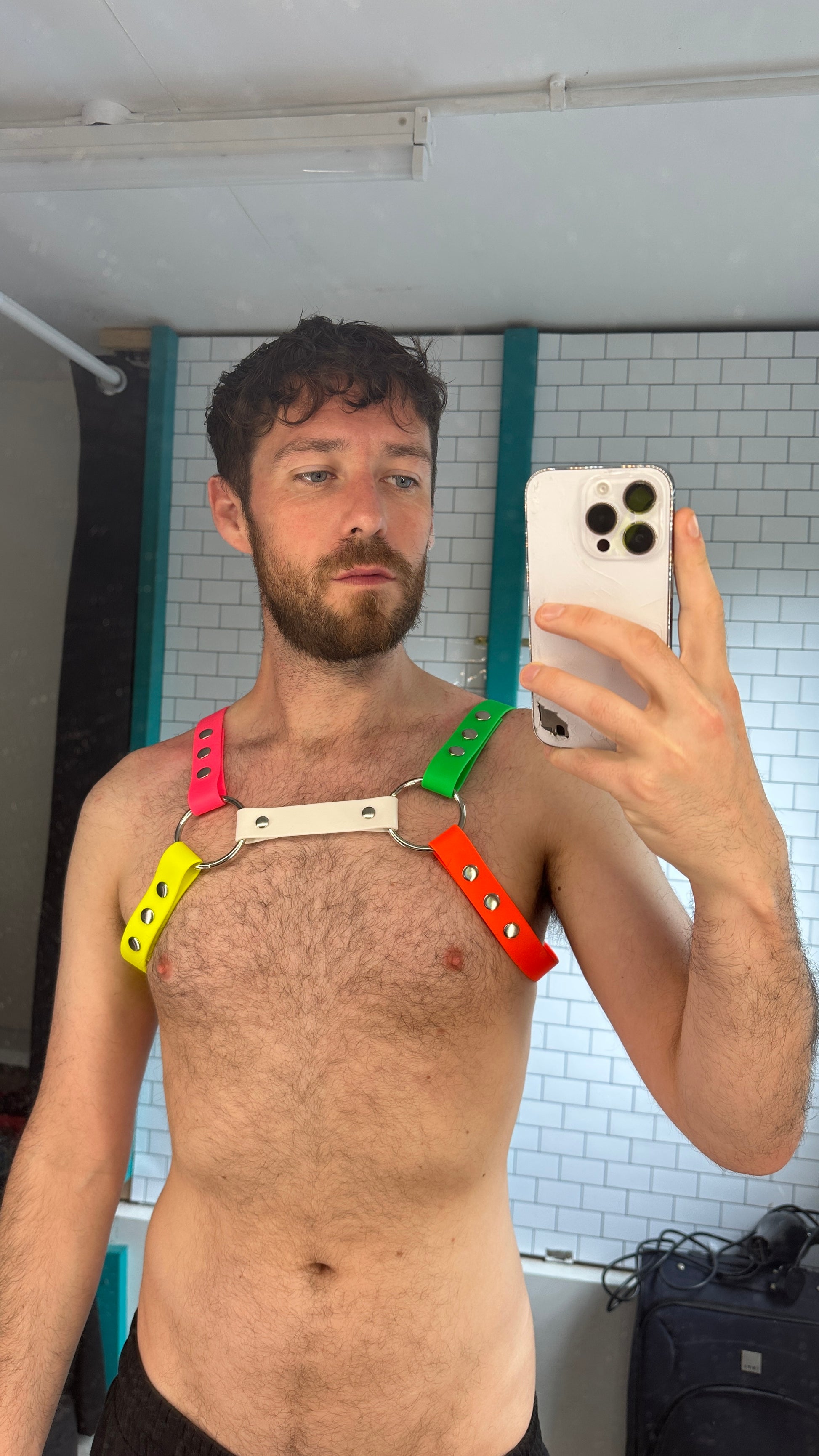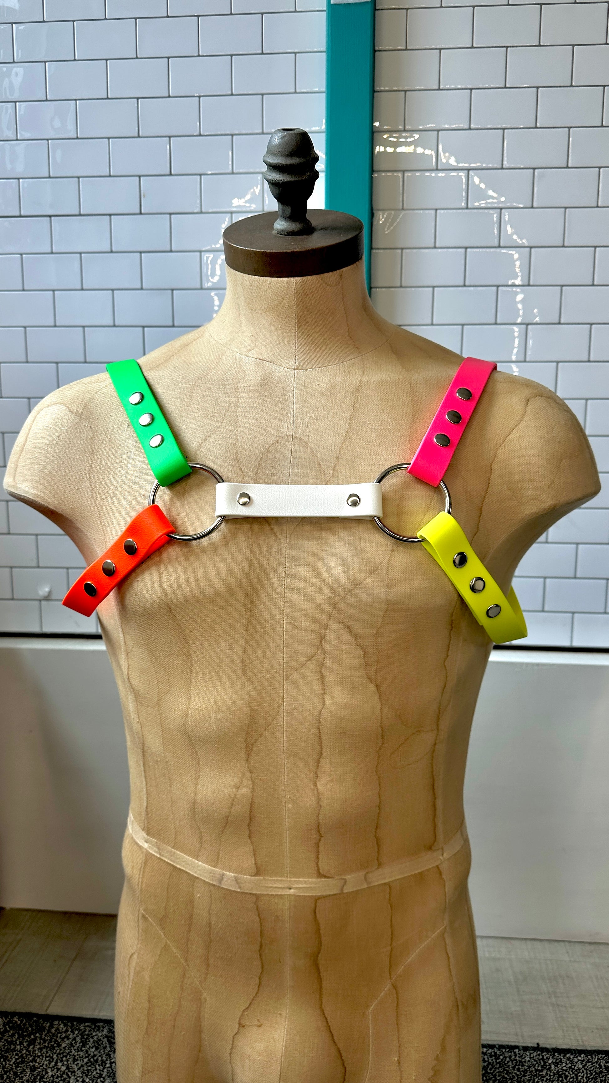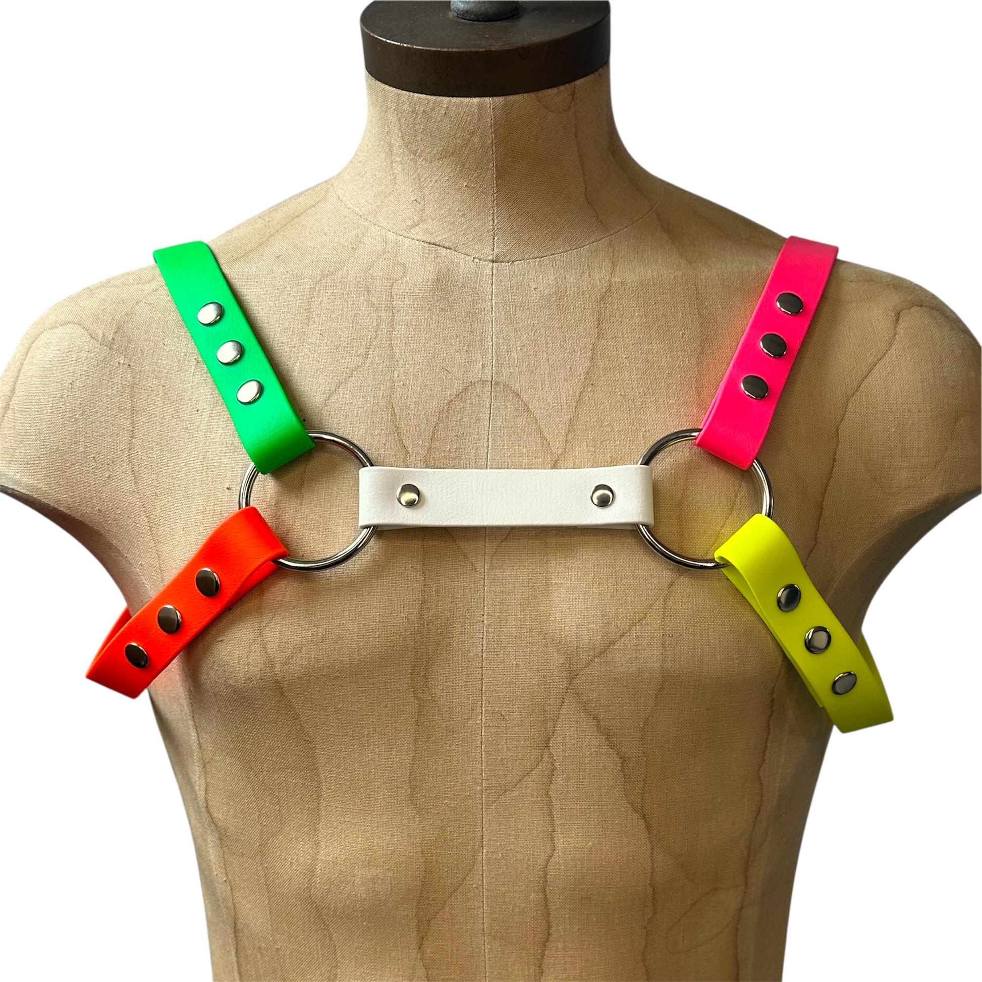 Our signature harness is built using lightweight PVC coated strapping, with a polyester core providing extra strength and durability, ensuring that the harness is easy to wipe down for cleaning and will last a lifetime - either on its own against your body, or paired over an outfit as an eye catching accessory.
